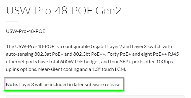 Most unifi switches are layer 2 only meaning they can handle vlans but cannot act a router. 4 10g sfp uplinks offer link aggregation for higher capacity and increased availability. Usw pro 48 poe 48 rj45 ports with 4 sfp ports layer 3 features in addition to layer 2 switching protocols and features the unifi pro poe switch offers layer 3 capabilities such as inter vlan routing static routing and dhcp server functionality. Powerful enterprise switch models.