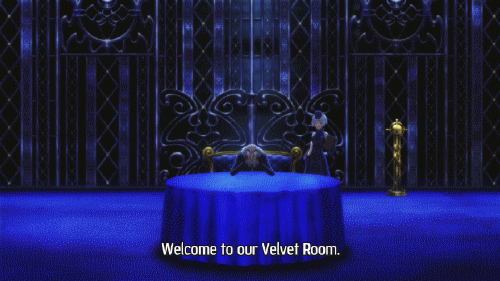 Welcome to the velvet room gif. The velvet room often manifests itself differently in the game but it is always covered in blue velvet and hosted by igor. This place exists between dream and reality mind and matter. The purpose of the velvet room is always to manage personas and use them in fusion. Welcome to the velvet room.